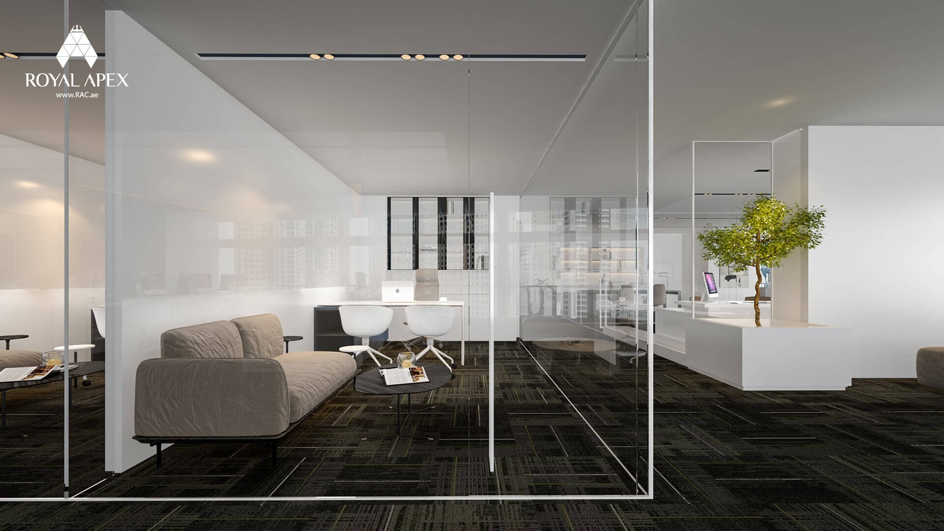 Experience the perfect blend of style and functionality with our "Sleek Office Retreat." This 3D rendering showcases an office room featuring a comfortable couch and a modern glass partition. The contemporary design encourages productivity and fosters a professional atmosphere. The harmonious combination of comfort and sophistication creates an inspiring workspace. With Royal Apex's expertise in interior design, we ensure that every element is thoughtfully curated to enhance your work environment. Explore the complete gallery to see more images of this exceptional project.