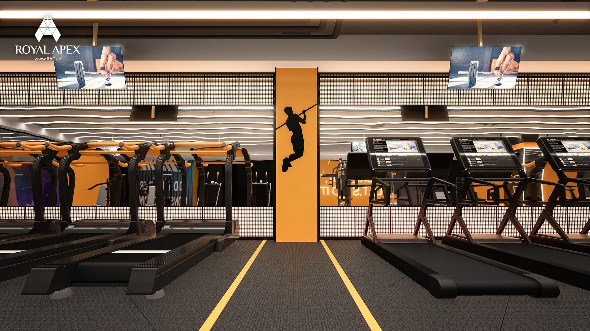 Get ready to elevate your fitness experience with our "Revitalizing Gym Haven." This 3D rendering presents a dynamic gym space equipped with treadmills and wall-mounted televisions. The energetic ambiance and state-of-the-art facilities inspire you to achieve your fitness goals. The carefully designed layout ensures maximum functionality and motivates your workout sessions. With Royal Apex's commitment to excellence, we create gym spaces that combine style and performance. Explore the complete gallery to discover more images of this invigorating project.