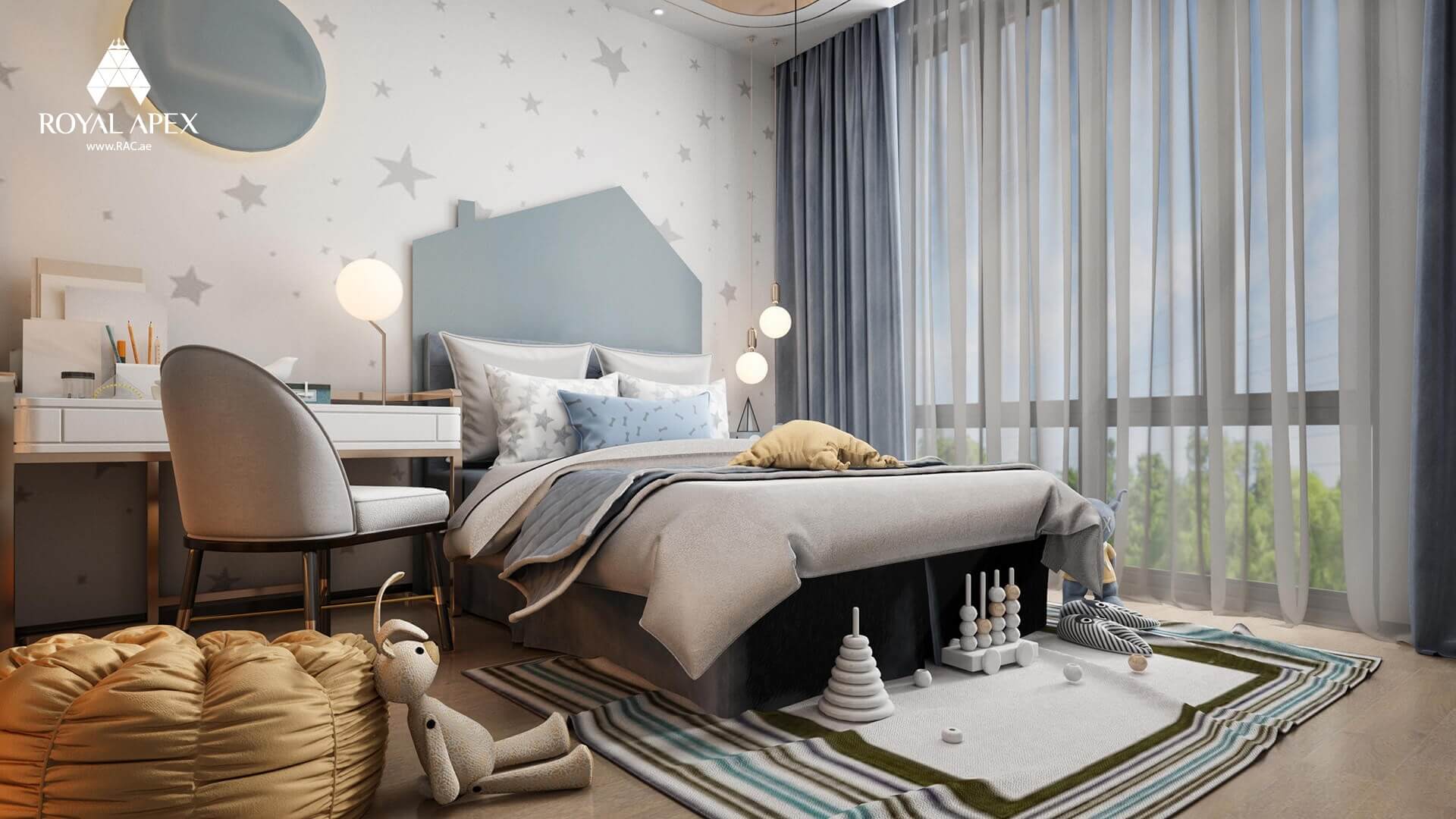 Ignite your child's imagination with our "Enchanting Kids Bedroom Haven." This delightful 3D rendering showcases a kids bedroom featuring a cozy bed, a functional desk, a comfortable chair, and a charming window. The vibrant colors and playful elements create a joyful and inspiring environment. With Royal Apex's expertise in designing spaces for children, we ensure a perfect blend of functionality and whimsical aesthetics. Explore the complete gallery to witness more captivating images of this magical project and create a dreamy space where your child's imagination can soar.